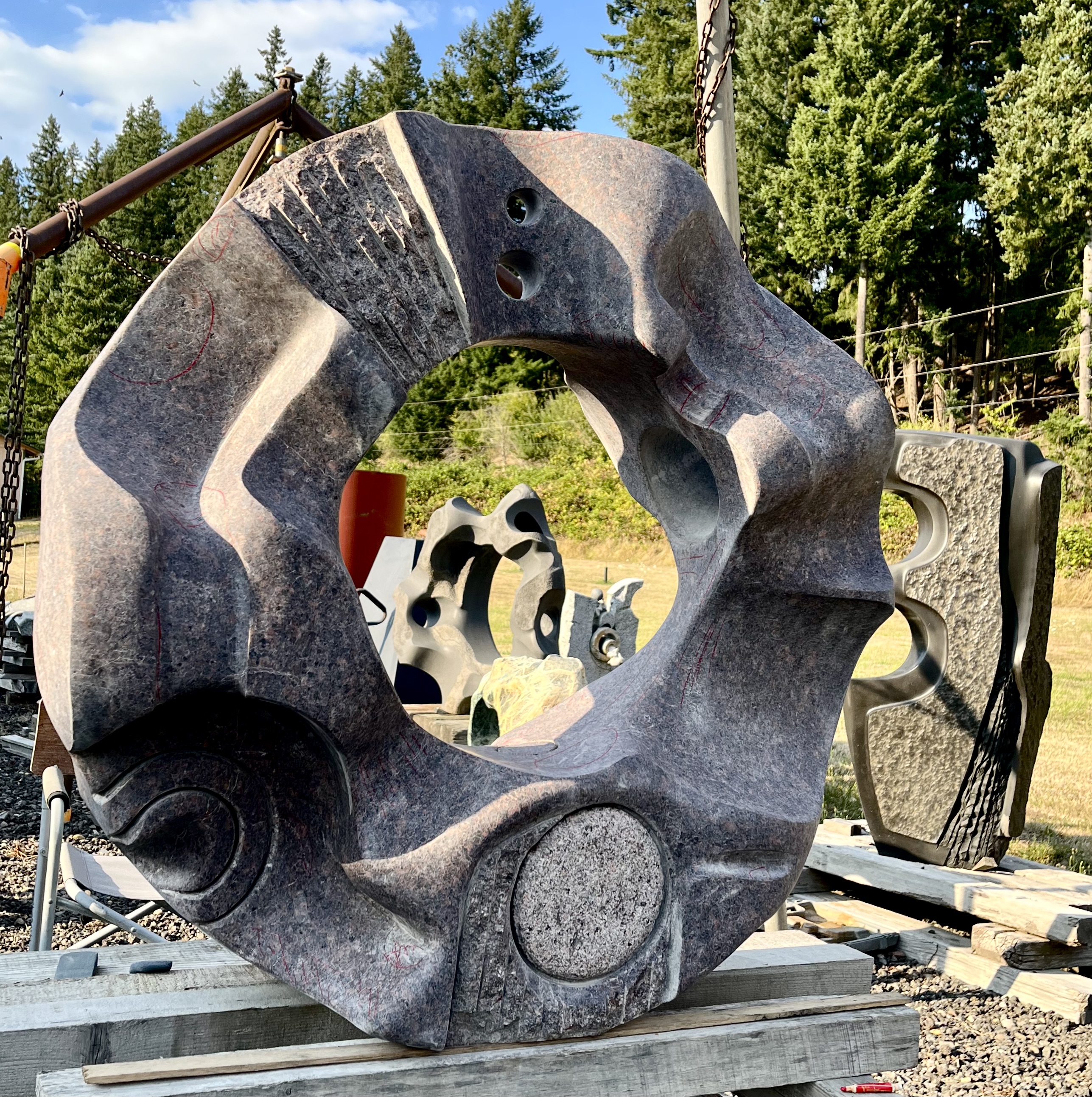 This stone started out as a 4' x 4' x 12" D square at 2000 pounds. It is now 4' in diameter and weighs 1000 pounds.